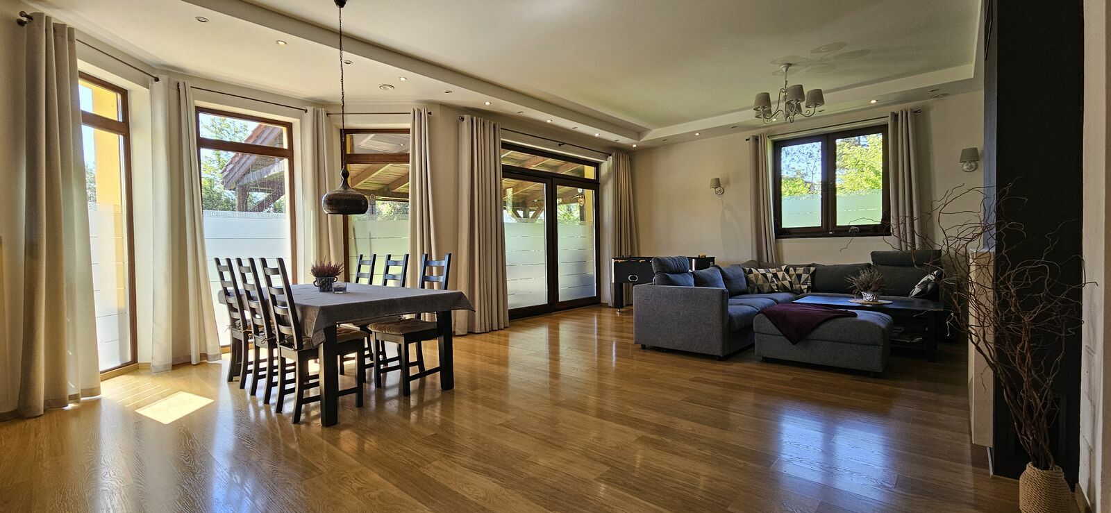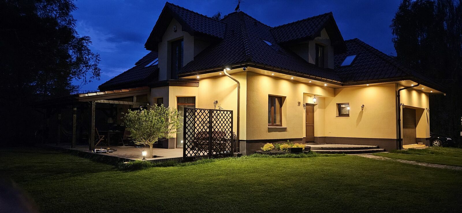 Jest w bardzo dobrym stanie, posiada wiele udogodnień (np: system inteligentnego domu, kamery, alarm, sieć komputerowa, instalacja telefoniczna, telewizyjna, głośnikowa, odkurzacz centralny, robot koszący).